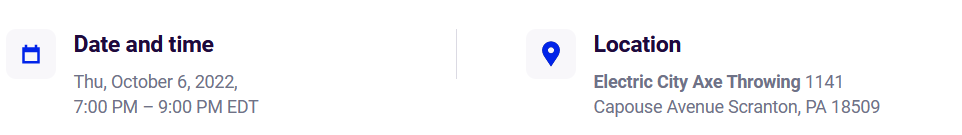 Electric City Axe Throwing Comedy Night Ladies, make a plan for you and your girl posse to break from the worries and stress of life to throw some axes and then listen to some jokes. The ticket price includes an hour of free time to throw axes and then a stand-up comedy show featuring comedians Jeannine Luby and Mary Rapach. You are welcome to bring your own wine or beer and snacks. When Jeannine isn’t chasing squirrels off her birdfeeder, she promotes laughter through wellness programs using Laughter Yoga and creates content for her marketing/communications clients. And sometimes she thinks of jokes while she’s trying to breathe and run at the same time. Mary was recently voted NEPA’s Funniest Comedian…for good reason! They are a co-founder of Scranton Improv and teach improv and stand-up comedy workshops there as well as perform. Mary has performed stand-up and improv comedy throughout NEPA and beyond and has served as the charming and hilarious emcee of many drag shows at The Ritz Theater. Register here!
