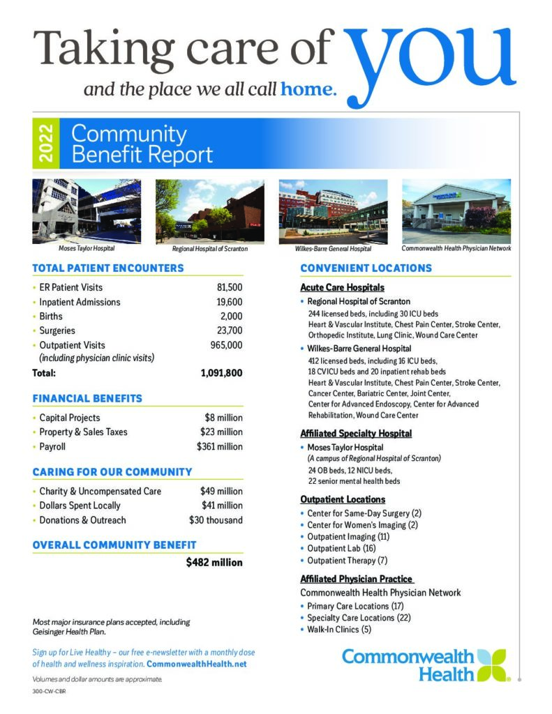 Commonwealth Health is a Cornerstone of Northeastern PA The skilled and compassionate hands of physicians, nurses and other team members of Commonwealth Health support the health and well-being of patients who turn to us for expert care. We are here, whenever needed. Beyond providing clinical care, Commonwealth Health is a cornerstone of our community and a major contributor to the economic health of Northeastern PA as a major employer and tax-payer and through our resources to expand and enhance the medical services available close to home. The overall impact is significant and totaled more than $482 million in 2022. Care was provided at more than 1 million patient encounters, including more than 81,500 emergency department visits, more than 19,600 inpatient admissions and more than 23,700 surgeries. Over 965,000 patients received care locally from our physician practices, walk-in locations and outpatient centers. Joy was delivered to local families with the birth of more than 2,000 babies at Moses Taylor Hospital and Wilkes-Barre General Hospital. “We help people get well and live healthier by providing quality care for patients,” said Michael Curran, chief executive officer for Regional Hospital of Scranton and Moses Taylor Hospital. “Our community is truly fortunate to have this dedicated team of clinicians who are making a real difference each and every day.” Commonwealth Health’s network provides a broad range of medical services, from highly specialized heart, lung and joint replacement surgery to more routine surgical needs and preventive care. Since 2022, more than 4,000 hearts beat stronger following cardiac catheterization at Commonwealth Health’s Heart & Vascular Institute located in Scranton and Wilkes-Barre. Eleven interventional cardiologists now offer this life-saving procedure and other treatments for heart health. Commonwealth Health and Rothman Orthopaedic Institute have announced a strategic alignment to transform the offering and delivery of orthopedic care and services in Northeastern PA. We expect to begin to serve patients through the affiliation in late summer 2023. Bringing moms and babies safely through childbirth is our priority. Our AI-based maternal-fetal early warning system monitors vital data throughout labor and delivery to help our maternity team recognize, prevent and respond to potential complications for an even safer birth. Simon Ratliff, chief executive officer for Wilkes-Barre General Hospital stated, “The vital care we provide is only one part of the broad impact we have. We are a cornerstone of this community and we are committed to doing all we can to provide excellent healthcare services and to making Northeastern PA a healthier, better community for all.” Commonwealth Health also gives back to Northeastern PA by providing over $49 million in charity and uncompensated care for the community’s most vulnerable. And the payment of $23 million in property and sales taxes helps support civic resources and services. The hospitals’ payroll of more than $361 million ripples across the local economy as employees buy goods and services. Last year the hospitals added enhanced benefits to help team members achieve their personal and professional goals, including assistance with student loan repayments, reimbursement of licensure and certification expenses, as well as tuition reimbursement. To train additional caring and skilled nurses, Jersey College and Commonwealth Health have collaborated to establish a School of Nursing on Moses Taylor Hospital’s campus, serving the greater region. We welcomed our first class of students in January 2023. To help the community live healthier, Commonwealth Health offers a free e-newsletter with a monthly dose of health and wellness inspiration sent directly to your inbox. Sign up at commonwealthhealth.net.