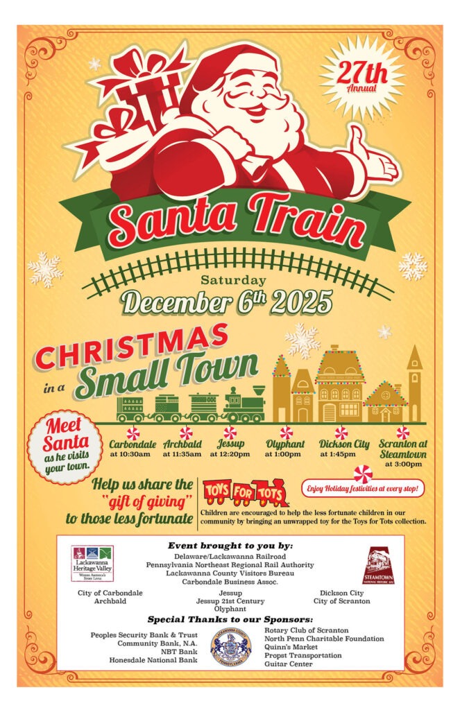 Steamtown NHS Presenting Santa Train Santa Claus is coming to town! Steamtown National Historic Site is proud to partner with the Lackawanna Heritage Valley Authority to present the 27th Annual Santa Train on December 6, 2025! Santa and his elves will be making scheduled stops at each of the historic stations below. Those interested are invited to bring their families to greet him and enjoy activities and refreshments! The event culminates at Steamtown National Historic Site, with tons of fun for the whole family! Carbondale Train Station – 10:30 AM Archbald Train Station – 11:35 AM Jessup Train Station – 12:20 PM Olyphant’s Queen City Train Station – 1:00 PM Dickson City Train Station – 1:45 PM Steamtown National Historic Site (Scranton) – 3:00 PM There is no cost to attend this event. Participants will not ride the train. Click here for more information.