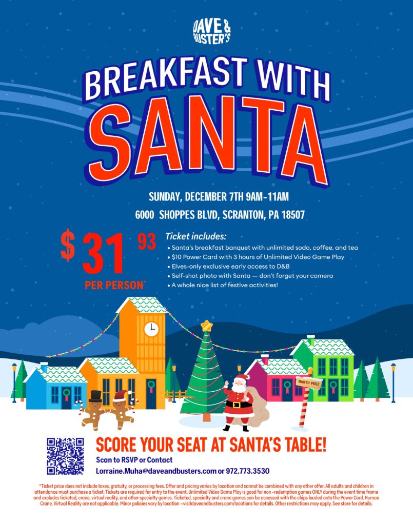 Dave & Buster’s To Host Breakfast With Santa It’s Time for Dave & Buster’s Annual Breakfast with Santa! A Holly Jolly Magical Morning filled with fun & festivities for the whole family to enjoy! Kick off the season with sparkle and cheer at the exclusive Breakfast with Santa event! Before doors open to the public, visiting families get VIP early access to a wonderland of holiday fun: Feast on a festive breakfast banquet Play games exclusively in our arcade Snap a keepsake photo with Santa himself Write letters to Santa & decorate holiday crafts Enjoy a cozy, joy-filled atmosphere perfect for all ages! Guests are invited to bring their camera, their wish list, and their holiday spirit—this isn’t just breakfast, it’s a holiday memory in the making! Spots are limited, so they should reserve their seat today and make this season unforgettable! Ticket Packages: 1. Santa Ticket: Santa’s breakfast banquet with soda, coffee, tea, & assorted juices, $10 Power Card® with 3-hrs of Unlimited Video Game Play, personal photo with Santa, merry & bright activities, taxes, and a suggested 18% gratuity. 2. Elf Ticket: Santa’s breakfast banquet with soda, coffee, tea, & assorted juices, taxes, and a suggested 18% gratuity. Click here for more information.