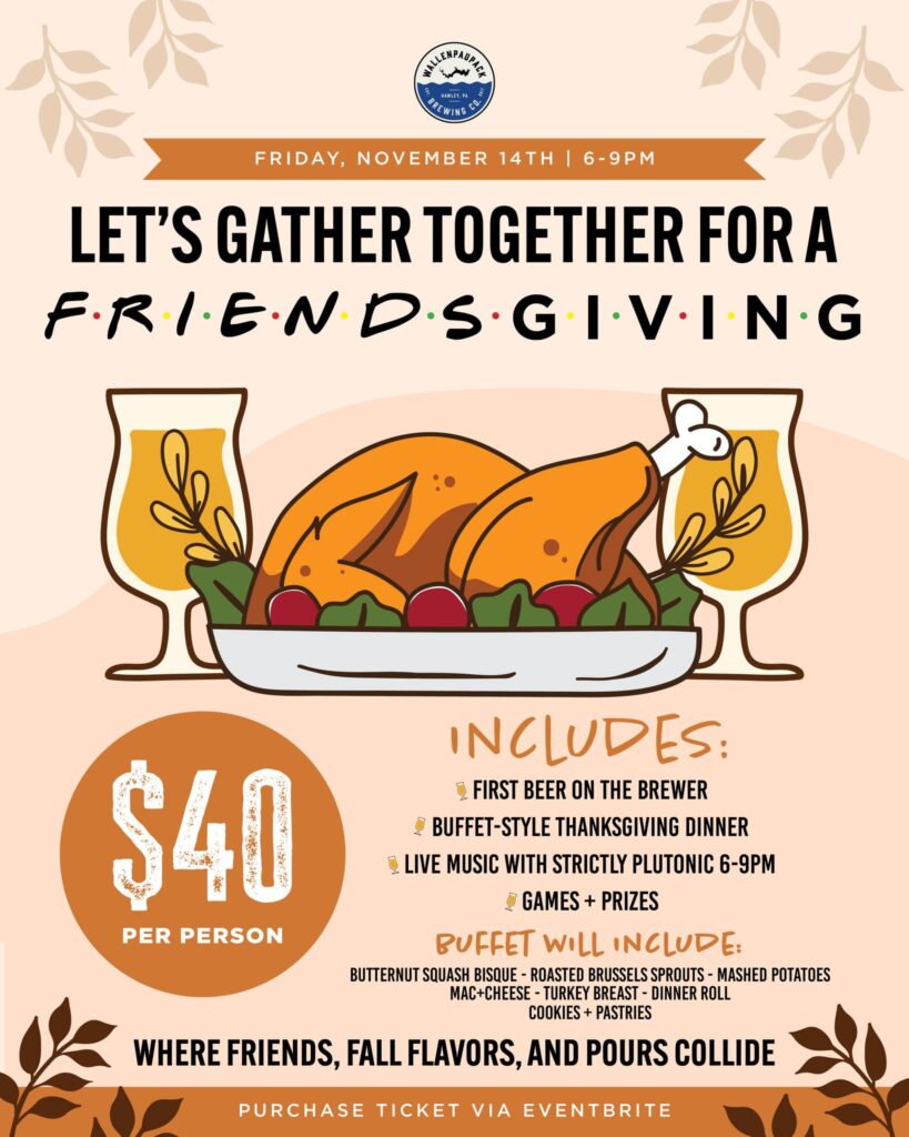 Wallenpaupark Brewing Co To Host Friendsgiving Friends are invited to gather and raise a glass to friendship, great beer, and even better company at Friendsgiving at the Brewery — an evening featuring live music, delicious food, and all their favorite beers on tap. Whether celebrating early with their chosen family or simply looking for a good time before the holiday hustle, guests can unwind, laugh, and make memories over a pint (or two). 𝗡𝗼𝘃𝗲𝗺𝗯𝗲𝗿 𝟭𝟰𝘁𝗵, 𝟲-𝟵𝗣𝗠 | $𝟰𝟬/𝗣𝗲𝗿 𝗣𝗲𝗿𝘀𝗼𝗻 Click here to find more information.