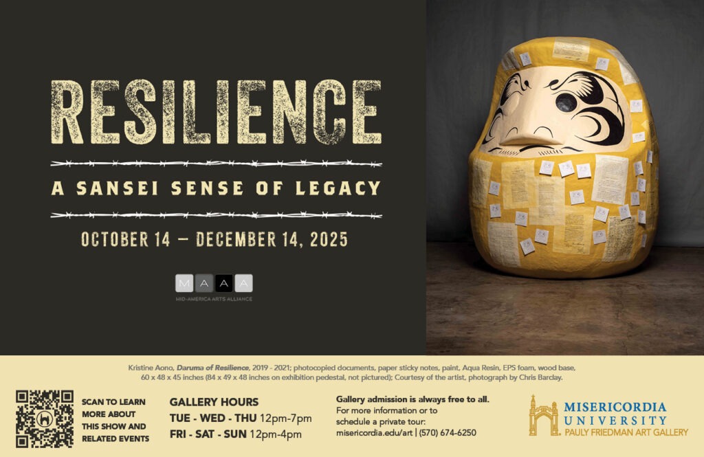 Misericordia University Art Gallery Presenting Sansei Legacy Exhibit Members News November 20, 2025 The Pauly Friedman Art Gallery at Misericordia University is currently presenting Resilience: A Sansei Sense of Legacy, on view until December 14, 2025. The exhibition is organized in partnership with the Mid-America Arts Alliance and features work by artist Kristine Aono. Gallery admission is free and open to the public. Gallery Hours:• Tuesday – Wednesday – Thursday: 12 PM–7 PM• Friday – Saturday – Sunday: 12 PM–4 PM For more information or to schedule a private tour, visit misericordia.edu/art or call 570-674-6250.