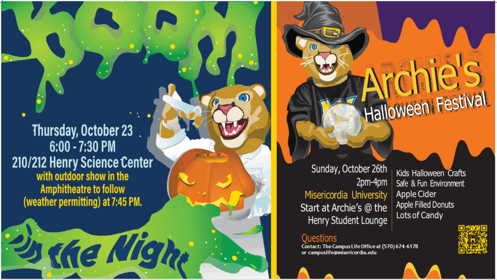 Misericordia University Presents Upcoming Halloween Events Members News October 23, 2025 Science Gets Spooky at Misericordia! The Dead Alchemist Society extends an invitation to its annual Boom in the Night event, taking place on Thursday, October 23rd, beginning at 6:00 p.m. in the Henry Science Center. Attendees will have the opportunity to participate in hands-on experiments with slime and foam, enjoy thrilling science demonstrations, and experience the ever-popular Puking Pumpkins show at the Wells Fargo Amphitheater (weather permitting). Click here for more information. Archie’s Halloween Festival Returns! The community is invited to an afternoon of Halloween fun for all ages on Sunday, October 26th, at 2:00 p.m. in the Henry Student Lounge. Guests can enjoy free candy, warm apple cider, apple-filled donuts, and spooky crafts for kids in a safe and festive environment. Costumes are encouraged, and admission is free. Click here for more information.