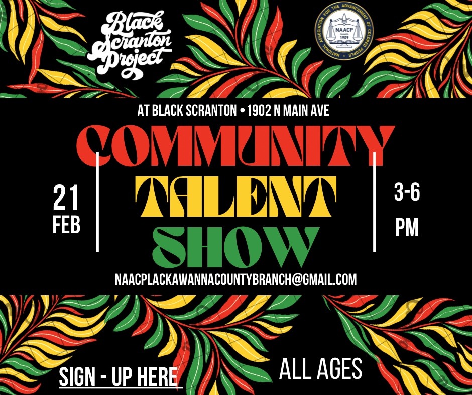 NAACP Lackawanna County Branch Hosts Community Talent Show Members News February 6, 2026 Come join us for a Black History Month event. All ages!Do you sing? 🎤 Dance? Tap or rap? Come join us for the NAACP Community Talent Show! Sign-up sheet coming! Sign-up at the link.