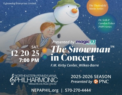 NEPA Philharmonic Presents Upcoming Programs Members News November 20, 2025 Join the Philharmonic Brass quintet in an intimate, candlelit setting of jazz and classical music in the beautiful Rotunda of the Luzerne County Courthouse on Friday, Nov. 21st at 7PM! Seating is limited and tickets are selling fast! Tickets are $29 in advance and $35 at the door, students $16 Click here for more information. The Snowman and the Snowdog A beloved Christmas classic is brought to life in spectacular fashion by the orchestra. This magical event is sure to create cherished memories for the entire family. Saturday, December 20th at 7PM at the F. M. Kirby Center, Wilkes Barre. Click here to find more information.