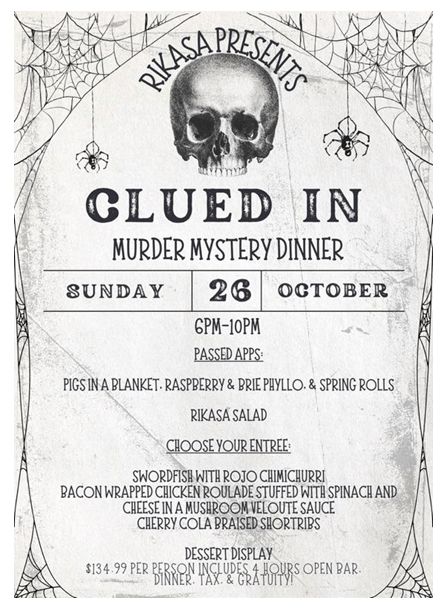 Rikasa Restaurant Presents Murder Mystery Dinner Members News October 16, 2025 Clued In: Murder Mystery Dinner October 26 @ 6:00 PM – 10:00 PM Back for its third thrilling year, Clued In returns to Rikasa on Sunday, October 26th at 6 PM. Participants and their teams will step into a real-life game of Clue, unraveling the mystery surrounding the murder of Mr. Bartholomew Boddy. Four levels of Rikasa serve as the playing board, where players hunt for clues, interrogate suspects, and race to solve the crime before time runs out. 🕵️♀️ 🎭 This year’s event features a special collaboration with the Wyoming Area Drama Club, whose members will interact with guests throughout the evening to bring the mysterious world of Clued In vividly to life. 🍸 Expect an evening of cocktails, suspense, and a dinner… to die for. 📍 Rikasa Restaurant – 53 S Main St, Pittston, PA⏰ Sunday, October 26th | 6PM – 10PM Click here to find more infomation.