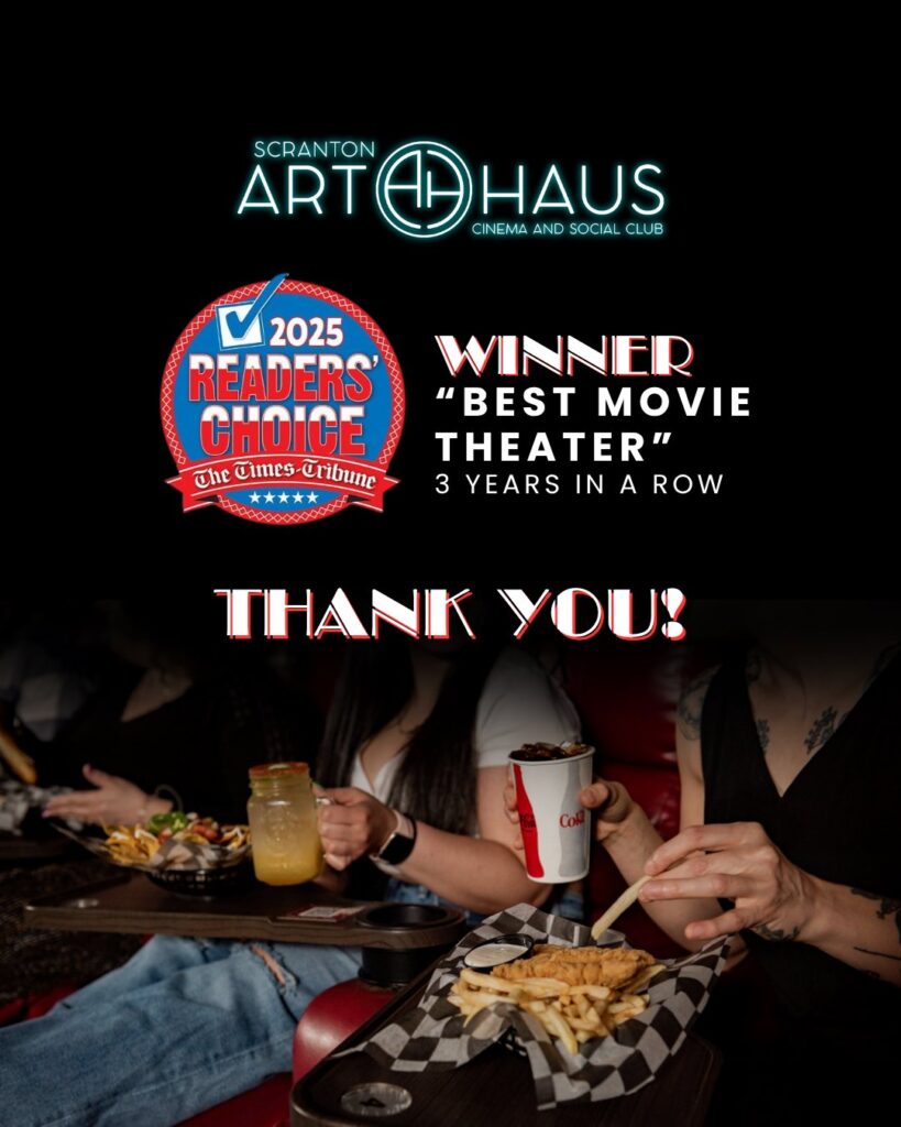 Scranton Art Haus Voted “Best Movie Theater” Members News October 30, 2025 Scranton Art Haus is thrilled to announce that it has been voted “Best Movie Theater” in the 2025 Scranton Times-Tribune Readers’ Choice Awards! The team extends heartfelt thanks to everyone who voted and continues to offer their support — this achievement is possible because of the community’s enthusiasm and loyalty.
