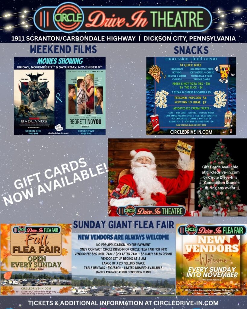 Circle Drive-In Upcoming Movie Showings Wednesday, July 23rd: FREE Community Movie, Celebrating Dickson City’s 150th Anniversary Screen One: “American Graffiti” (PG – 1973) at 9:00 pm Gates & Box Office 8:00 pm Thursday, July 24th: The Lackawanna Historical Society Movie Night Screen One: “National Lampoon’s Christmas Vacation” (PG-13 – 1989) at 9:00 pm As always, we encourage you to get in the Christmas spirit & come dressed as your favorite character or in your favorite Christmas attire! Gates & Box Office 8:00 pm Friday, July 25th & Saturday, July 26th DOUBLE FEATURES ON BOTH SCREENS! Gates & Box Office 8:00 pmScreen One:“The Fantastic Four: First Steps” (PG-13 – 2025) at 9:00 pm“Thunderbolts*” (PG-13 – 2025) at 11:30 pmScreen Two:“Superman” (PG-13 – 2025) at 9:15 pm“Jurassic World: Rebirth” (PG-13 – 2025) at 11:45 pm Sunday, July 27th Circle Giant Flea Fair from 6:00 am – 2:00 pm (Vendor Gates at 5:00 am) New vendors are always welcome, no pre-registration required! Come out & sell your crafts, artisan items, homemade products, spring cleaning treasures & more – every Sunday! Learn more at circledrive-in/fleafair24. Sunday Night Movies Gates & Box Office 8:00 pm Screen One: “The Fantastic Four: First Steps” (PG-13 – 2025) at 9:00 pm Screen Two: “Superman” (PG-13 – 2025) at 9:15 pm Upcoming Films & Events: Thursday, July 31st – The Lackawanna Historical Society presents “Dirty Dancing” at 9:00 pm Saturday, August 2nd – Girl Gang Film Fest Returns – 2:00 pm Saturday, August 9th – NEPA Mimosa Festival – 11:00 am – 5:00 pm Our Concession Stand is open during every event! Stop in for your favorite cold drinks, candy, popcorn, freshly made pizza, burgers & more! Movie tickets, upcoming events, & additional information at circledrive-in.com.