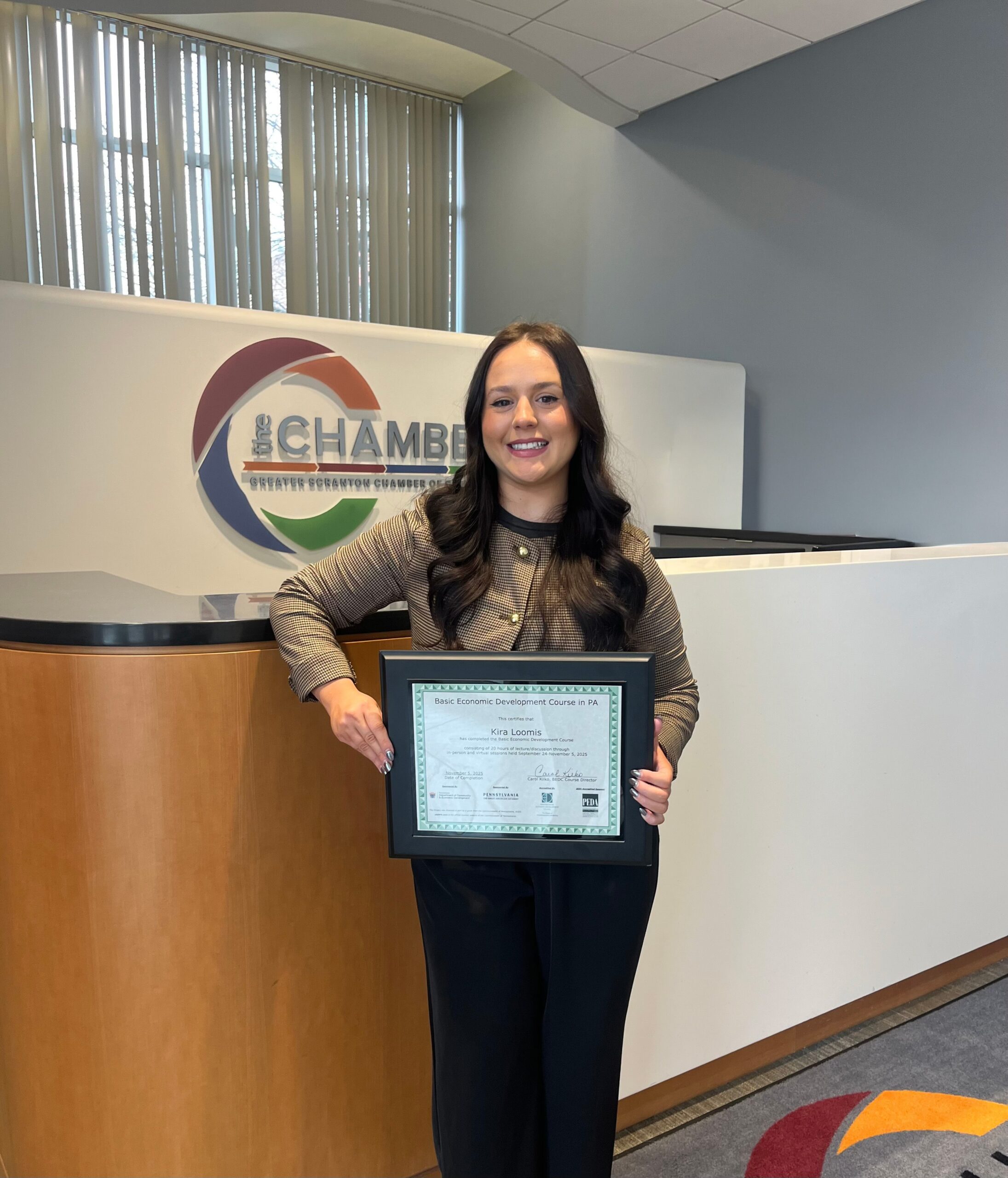 Kira Loomis Successfully Completes IEDC-Accredited Basic Economic Development Course Kira Loomis, business development specialist at The Greater Scranton Chamber of Commerce, has completed the Basic Economic Development Course (BEDC), sponsored by the Pennsylvania Economic Development Association (PEDA) and accredited by the International Economic Development Council (IEDC). The BEDC course is designed to prepare professionals with essential knowledge and skills in economic development. Throughout the course, Loomis expanded her understanding of key economic development theories, gained practical tools for navigating today’s dynamic economic landscape, and fostered meaningful connections with fellow professionals in the field. Sharing her thoughts on the achievement, Loomis expressed, “This course was an incredible opportunity to deepen my understanding of economic development and connect with professionals who are passionate about strengthening communities. I’m excited to apply what I’ve learned to make a meaningful impact.” Congratulations to Loomis on this milestone in her professional development.