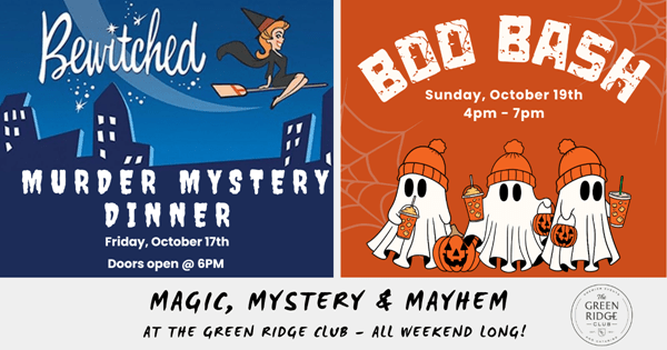 The Green Ridge Club Presents Weekend Halloween Events Members News October 16, 2025 Guests can kick off their weekend with the Bewitched Murder Mystery Dinner—an evening filled with laughter, intrigue, and retro TV charm. 🕵️♀️ Bewitched Murder Mystery Dinner Friday, October 17 | Doors open at 6PM 🎟️ $65 per person – Dinner, show & a drink included Click here for more information.